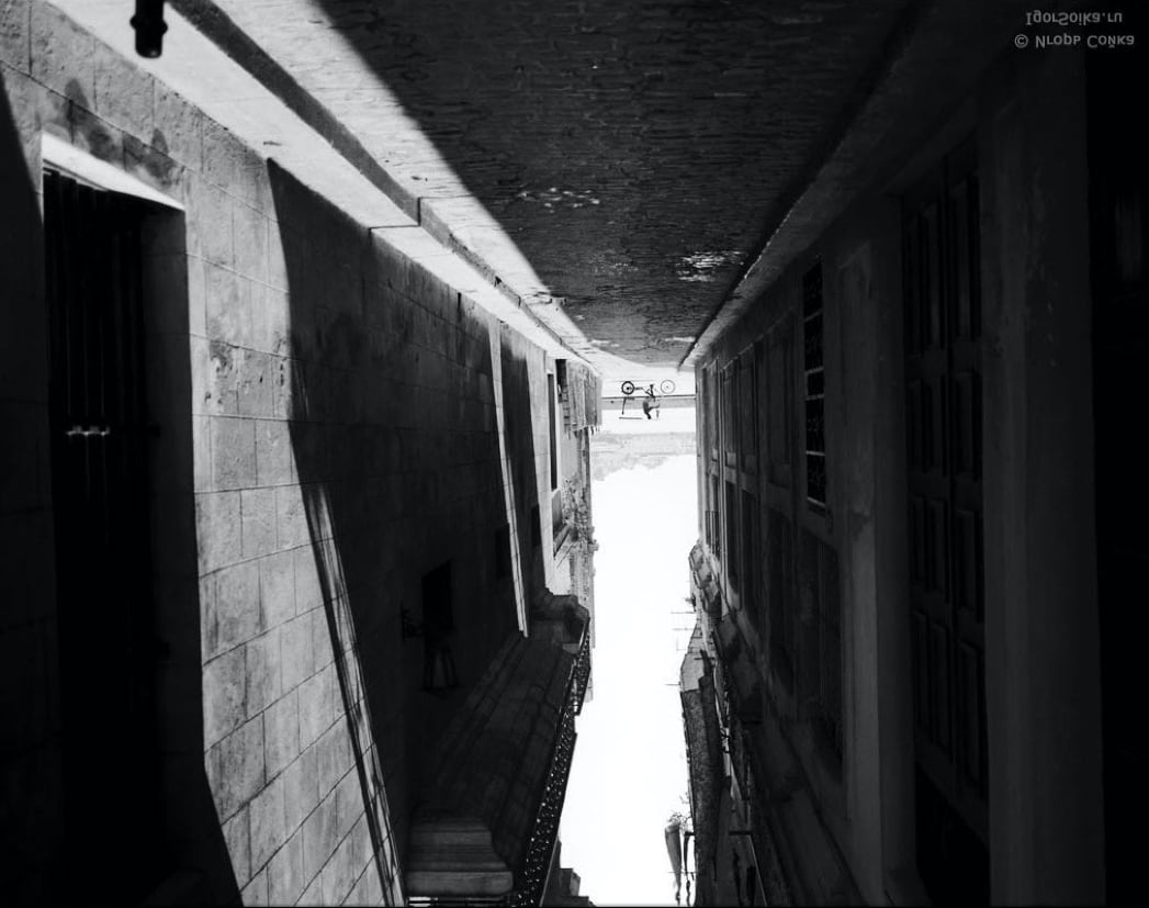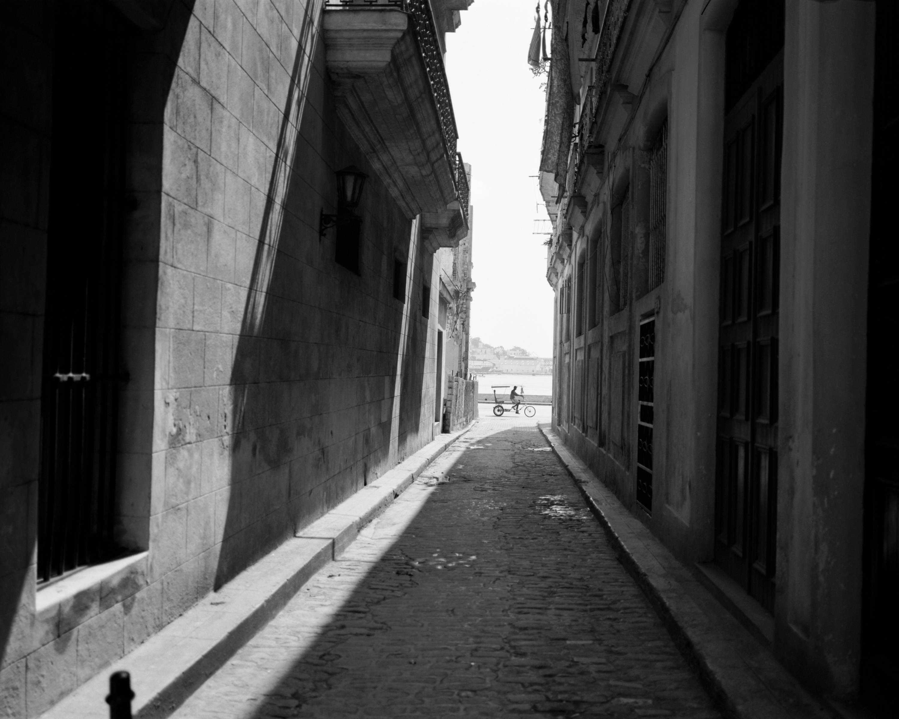 Minimalist black-and-white Image of a cycle rickshaw on the streets of Old Havana.